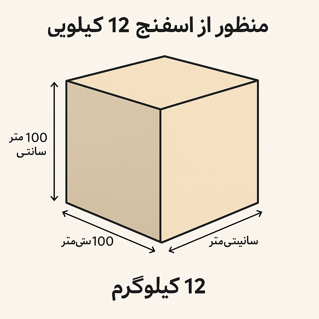 حالا اگر وزن این یک متر مکعب اسفنج ۱۲ کیلوگرم باشد، این محصول اسفنج ۱۲ کیلویی نامیده میشود.
